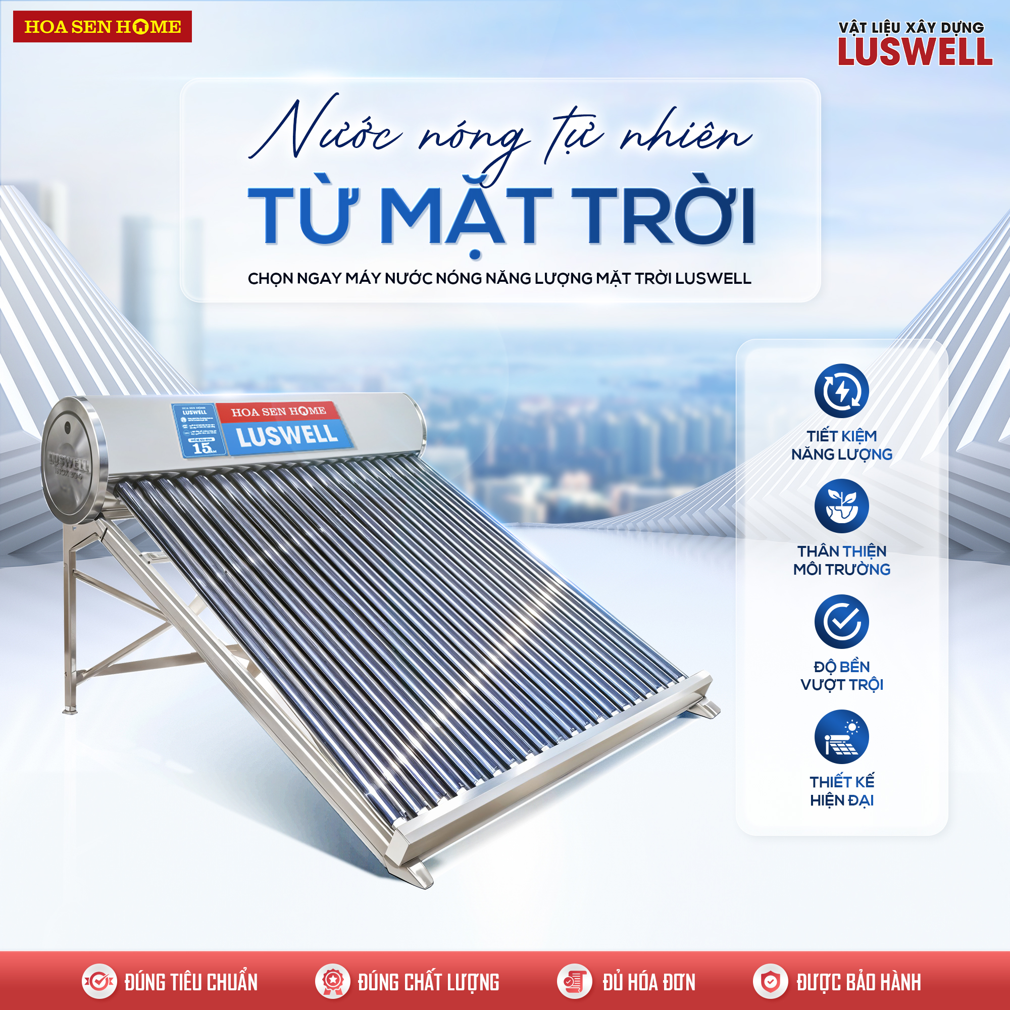 Máy nước nóng năng lượng mặt trời Luswell VNVIE là sự kết hợp hoàn hảo giữa công nghệ tiên tiến, chất liệu bền bỉ và thiết kế thông minh, mang lại sự tiện nghi, tiết kiệm năng lượng và an toàn cho mọi gia đình. Phi ống hấp thụ nhiệt cũng là phi thông dụng nên dễ dàng thay thế khi gặp sự cố. Đây chính là lựa chọn tối ưu cho cuộc sống xanh bền vững.